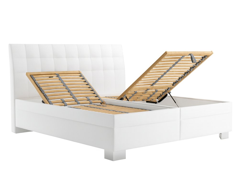 Luxusní lůžko, které uspokojí i ty nejnáročnější zákazníky. Je kvalitním českým výrobkem od dodavatele s dlouholetými zkušenostmi v oblasti výroby postelí. Stane se dominantou Vaší ložnice a poskytne Vám příjemný odpočinek. Plocha pro spaní je 180x200 cm s komfortní výškou ložné plochy cca 64 cm. Postel je vybavena polohovacím lamelovým roštem. Postel je bez matrace, kterou můžete dokoupit z naší nabídky. Rošt má 28 lamel s popruhem proti přetížení a možností nastavení tuhosti. Rošt je také vybavený polohováním pro hlavu (5 poloh) i nohy (1 poloha). Samozřejmostí je i velký úložný prostor na lůžkoviny, který je přístupný od nohou pomocí pístů. Postel je očalouněna kvalitní koženkou Loft 1 v bílé barvě.