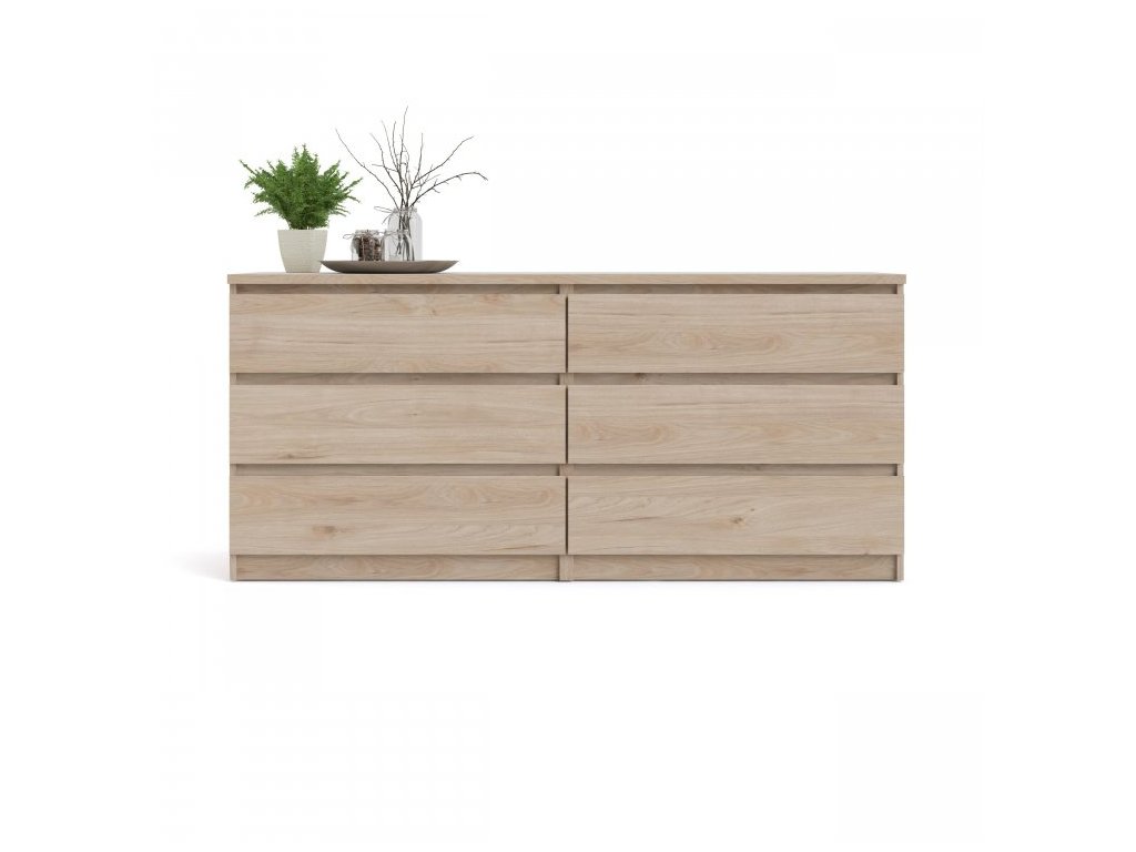 Komoda Naia je rozdělena na 2 části a celkem má 6 zásuvek. Komoda je vyrobena z lamina v provedení jackson hickory. Zásuvky jsou v bezúchytkovém provedení s kvalitními kovovými pojezdy. Zboží je dodáváno v demontu se schématickým návodem na montáž. Komoda je ze série Naia, ze které můžete vybírat také další prvky jako noční stolky, skříně, postele aj. Komodu nabízíme také v dalších barevných provedeních.