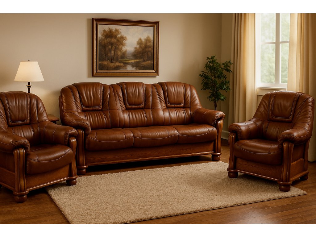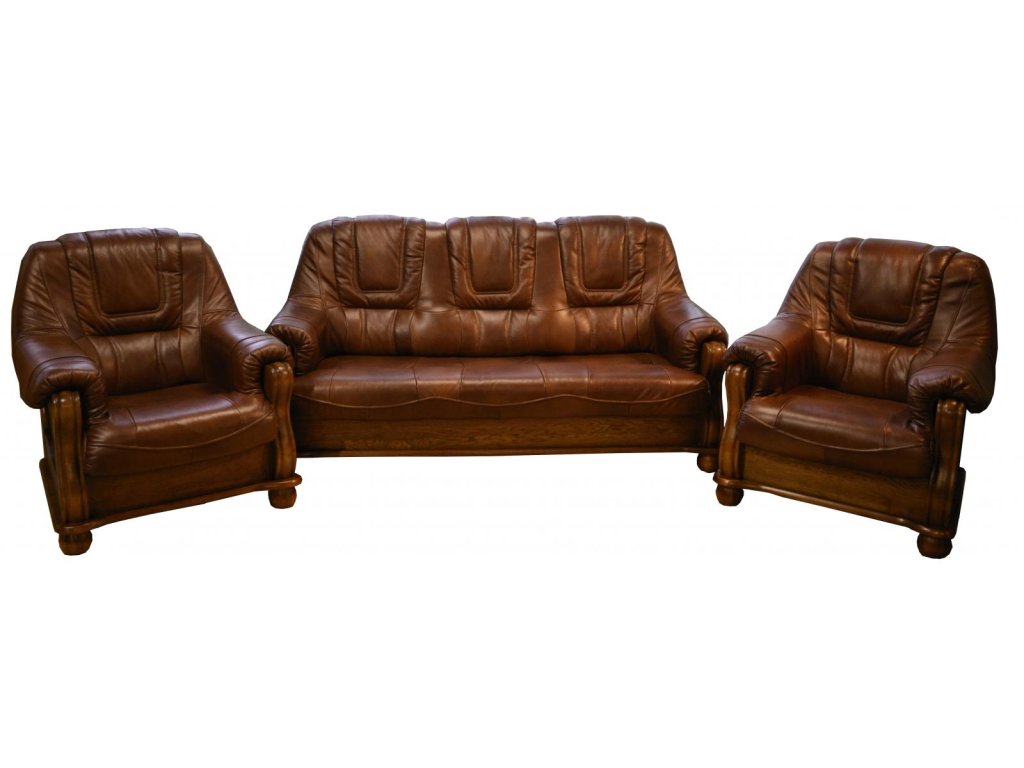 Luxusní kožená sedací souprava potažená pravou hovězí kůží v odstínu DTS50, barva dřeva odstín D9 (viz menší obrázky, úvodní obrázek je pouze ilustrační). Sedací souprava se skládá z trojsedu a dvou křesel. Trojsed je rozkládací, rozklad pomocí výsuvného vozíku (v nabídce také varianta bez rozkladu). Celá kostra sedací soupravy je vyrobena z dubového masivu, který zaručuje její dlouhou životnost. Vyplněna je bonellovými pružinami. Cena zboží je bez vyobrazených dekorací a doplňků. V naší nabídce jsou také další barevné možnosti nebo verze bez rozkladu.