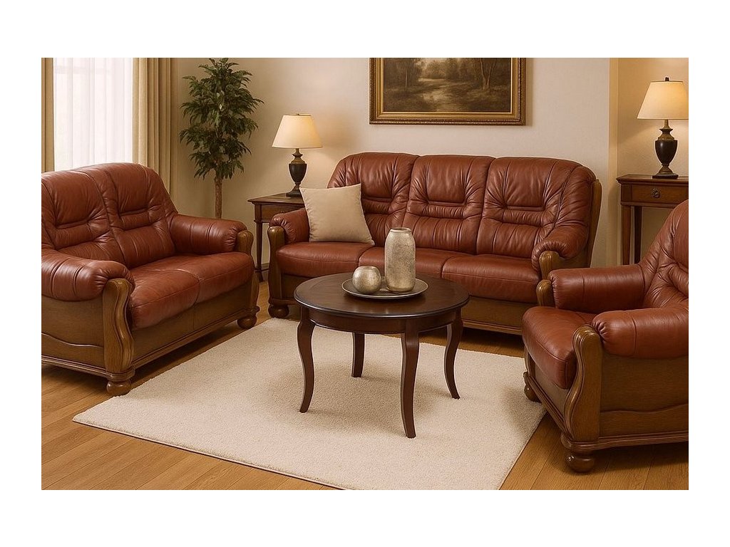Luxusní kožená sedací souprava potažená pravou hovězí kůží v odstínu DTS50 a barvě dřeva D9. Sedací souprava se skládá z trojsedu, dvojsedu a křesla. Trojsed je rozkládací pomocí výsuvného vozíku (v nabídce také varianta bez rozkladu). Můžete vybírat z různých barevných provedení kůže i dřeva. Celá kostra sedací soupravy je vyrobena z dubového masivu, který zaručuje její dlouhou životnost. Vyplněna je bonellovými pružinami. Cena zboží je bez vyobrazených dekorací a doplňků. Upozorňujeme, že u této sedací soupravy budeme požadovat zálohu ve výši 20% nebo platbu předem.