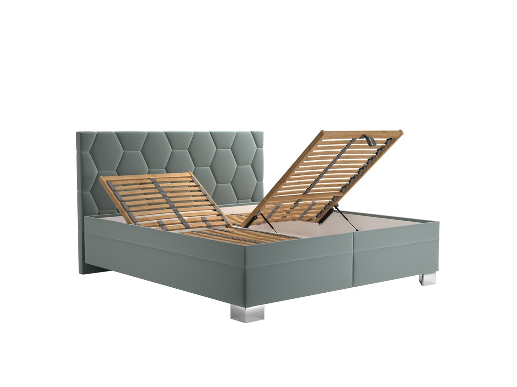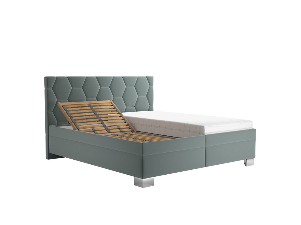 Moderní čalouněné dvoulůžko tradičního českého výrobce postelí je zárukou kvalitního spánku. Základem lůžka je 28 lamelový rošt s mechanickým polohováním hlavy a nohou (7 poloh hlavy, 1 poloha nohou), s nastavením tuhosti lamel a s popruhem proti přetížení. Rošt se skládá z 28 lamel uložených ve výkyvných kaučukových pouzdrech. Snadnější manipulaci při otevírání úložného prostoru zajišťují plynové písty. Postel je dodávána s roštem bez matrací. Postel je očalouněna do kvalitní čalounické látky Riviera v zeleném odstínu.