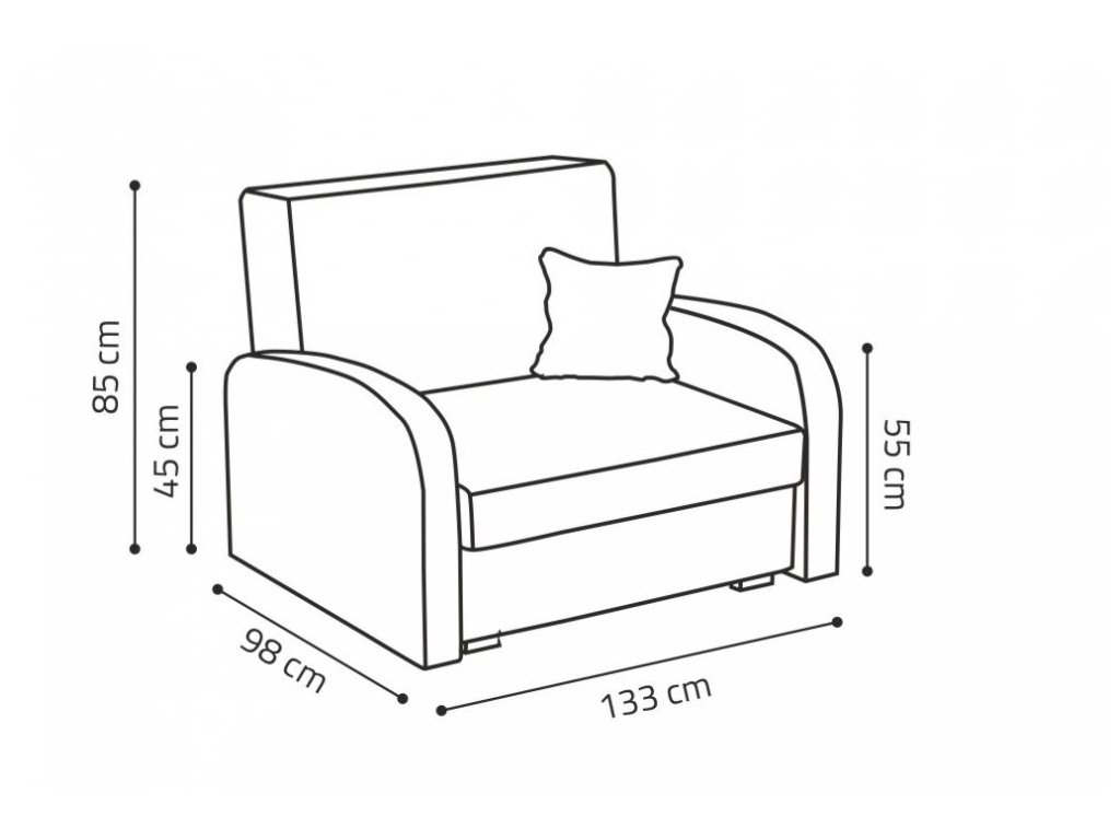 Rozkládací křeslo se díky malým rozměrům bude hodit do dětských, studentských nebo obývacích pokojů. Pohovka je rozkládací s praktickým úložným prostorem a výborně zapadne do každého interiéru. Pohovka je vyrobena v jednoduchém designu. Velmi zajímavým prvkem je prošití opěrky. Výplň sedáku tvoří kombinace vlnitých pružin bonell s kvalitní PUR pěnou. Pohovka je vyrobena z kvalitní látky Kronos 19. Jednoduchým rozložením pomocí automatu vznikne dostatečně prostorné lůžko k občasnému přespání. Vybrat si můžete z několika atraktivních odstínů. Součástí pohovky je jeden dekorační polštář. Další vyobrazené dekorace a doplňky nejsou v ceně. Tuto pohovku/rozkládací křeslo nabízíme v dalších barvách a rozměrech.
