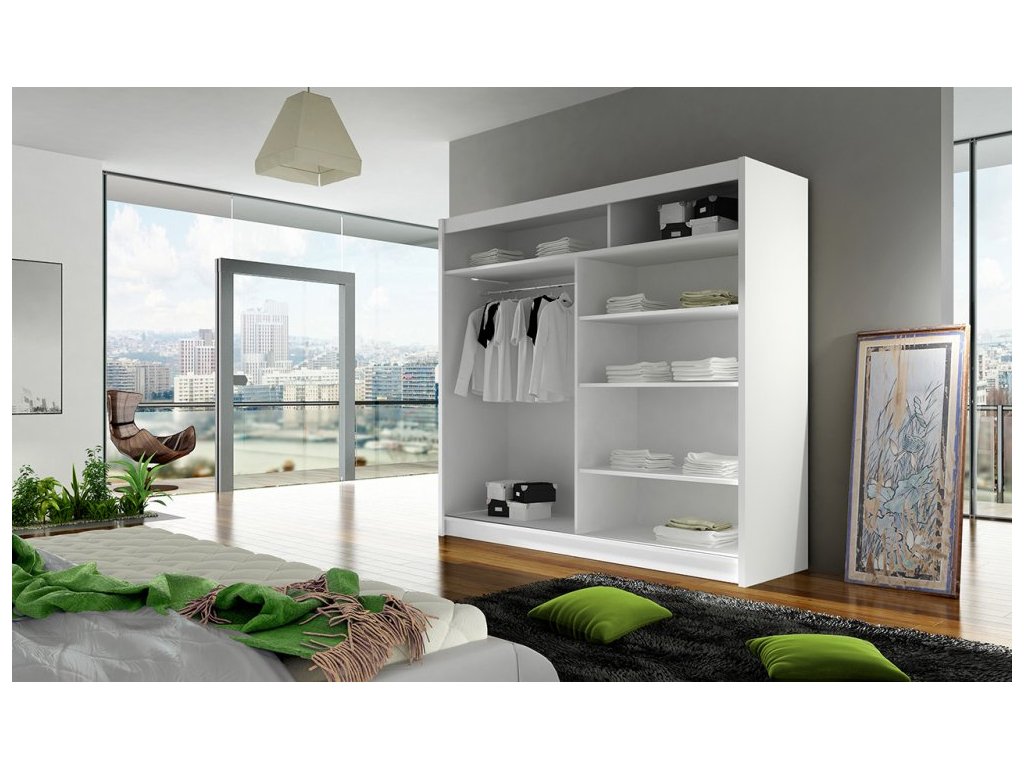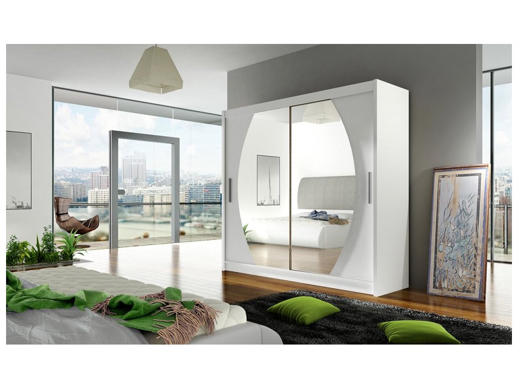 Prostorná bílá šatní skříň se zrcadlem Bega IV v moderním designu nabízí velké množství praktického úložného prostoru. Skříň široká 180 cm má v jedné části velké police a v druhé tyč na zavěšení oděvů (viz obrázek). Posuvné dveře šetří prostor a zrcadlo ve tvaru oblouku obzvláštní každý interiér. Kvalitní hliníkové pojezdy zajišťují dlouhou životnost a dlouhé stříbrné úchyty doplňují moderní design skříně. Korpus a dveře jsou vyrobeny z kvalitního lamina (16 mm) a hrany jsou ukončeny ABS lištou.