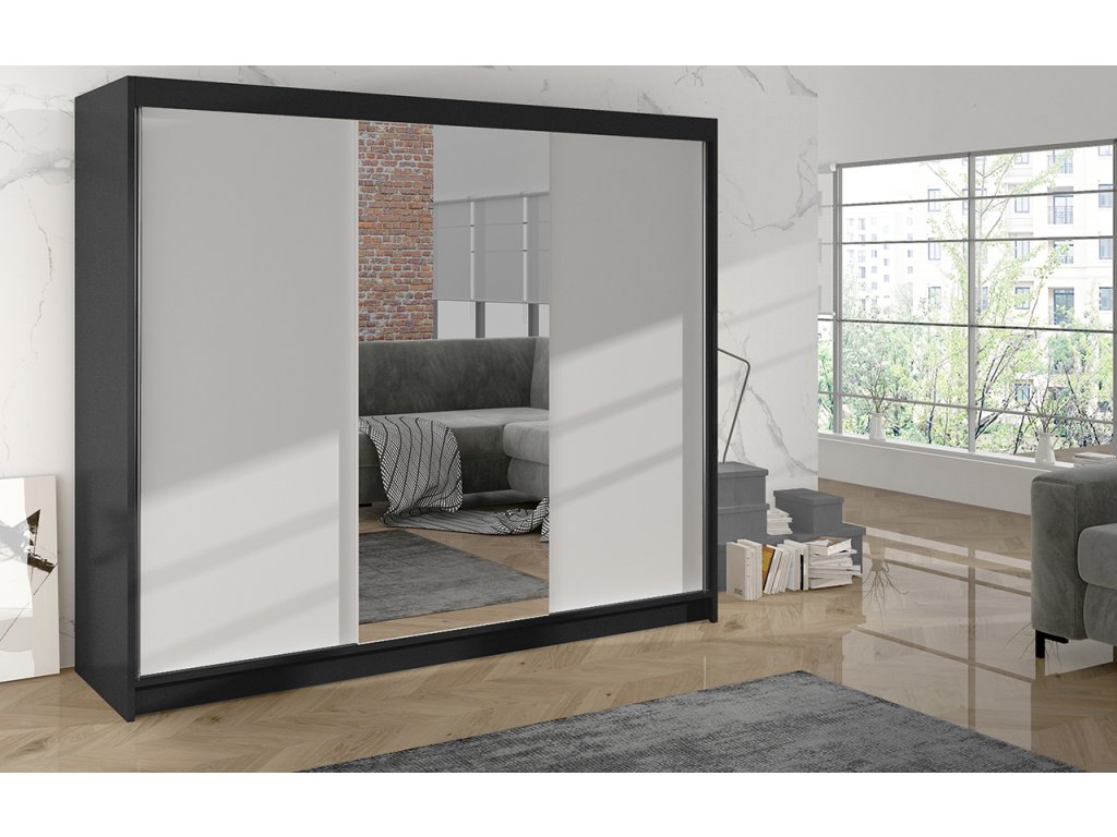 Šatní skříň Debora I v moderním designu má šířku 200 cm a je rozdělena na tři praktické části. Posuvné dveře šetří místo a usnadňují přístup do interiéru. Vnitřní uspořádání kombinuje závěsnou tyč a devět polic, což umožňuje přehledné a praktické rozdělení šatníku.