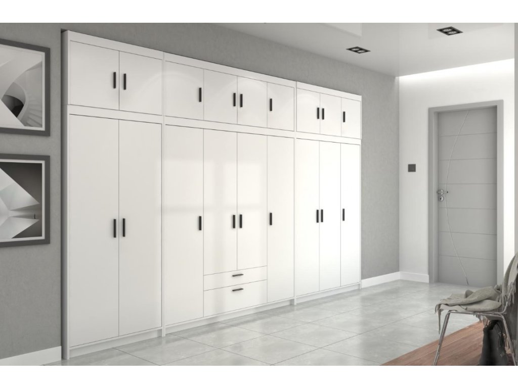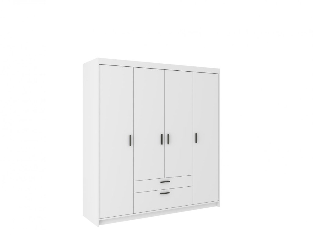 Klasická čtyřdveřová skříň v jednoduchém čistém designu v bílé barvě a s černými úchyty má 2 zásuvky. Uvnitř skříně jsou police i šatní tyč. Skříň je vyrobena z lamina o tloušťce 15mm. Tuto skříň nabízíme také v dalších provedeních (šířka, barevné kombinace, počet dvířek a zásuvek). Ke skříni je možné dokoupit také nádstavec, který také naleznete v naší nabídce. Zboží je dodáváno v demontu se schematickým návodem k montáži.