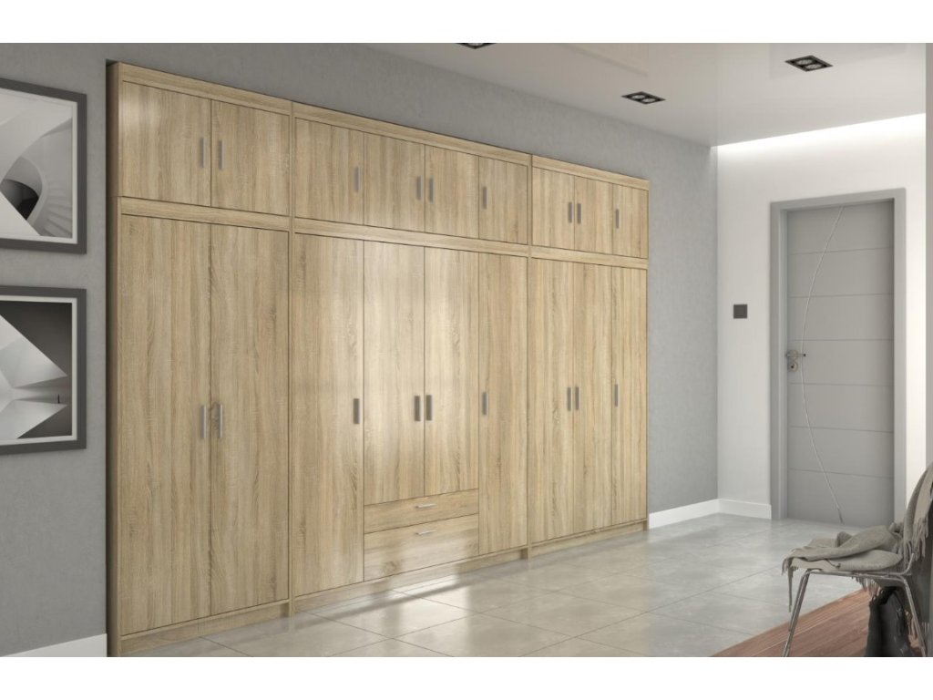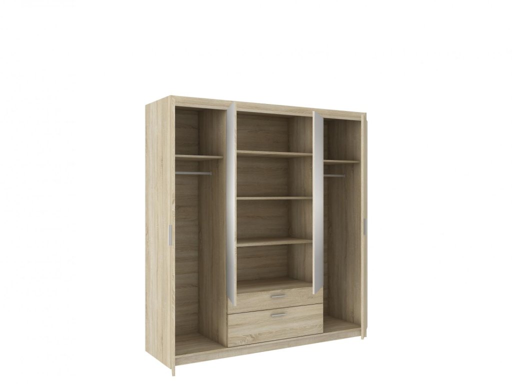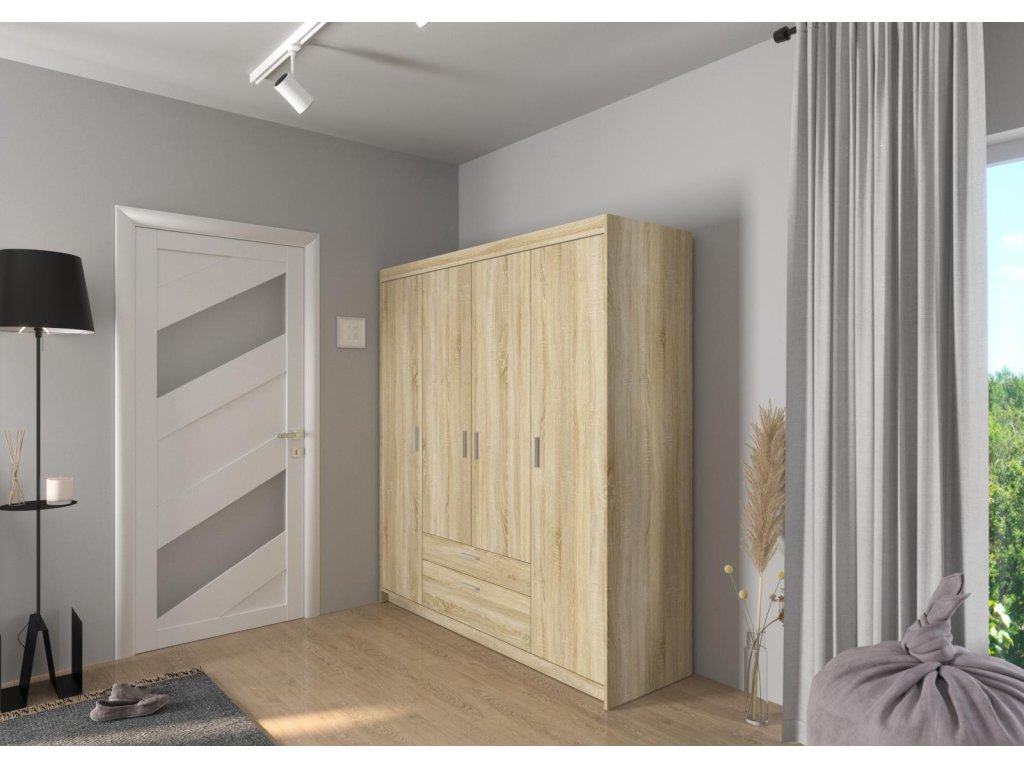 Klasická čtyřdveřová skříň v jednoduchém čistém designu v barvě dub sonoma s černými úchyty má 2 zásuvky. Uvnitř skříně jsou police i šatní tyč. Skříň je vyrobena z lamina o tloušťce 15mm. Tuto skříň nabízíme také v dalších provedeních (šířka, barevné kombinace, počet dvířek a zásuvek). Ke skříni je možné dokoupit také nádstavec, který také naleznete v naší nabídce. Zboží je dodáváno v demontu se schematickým návodem k montáži.