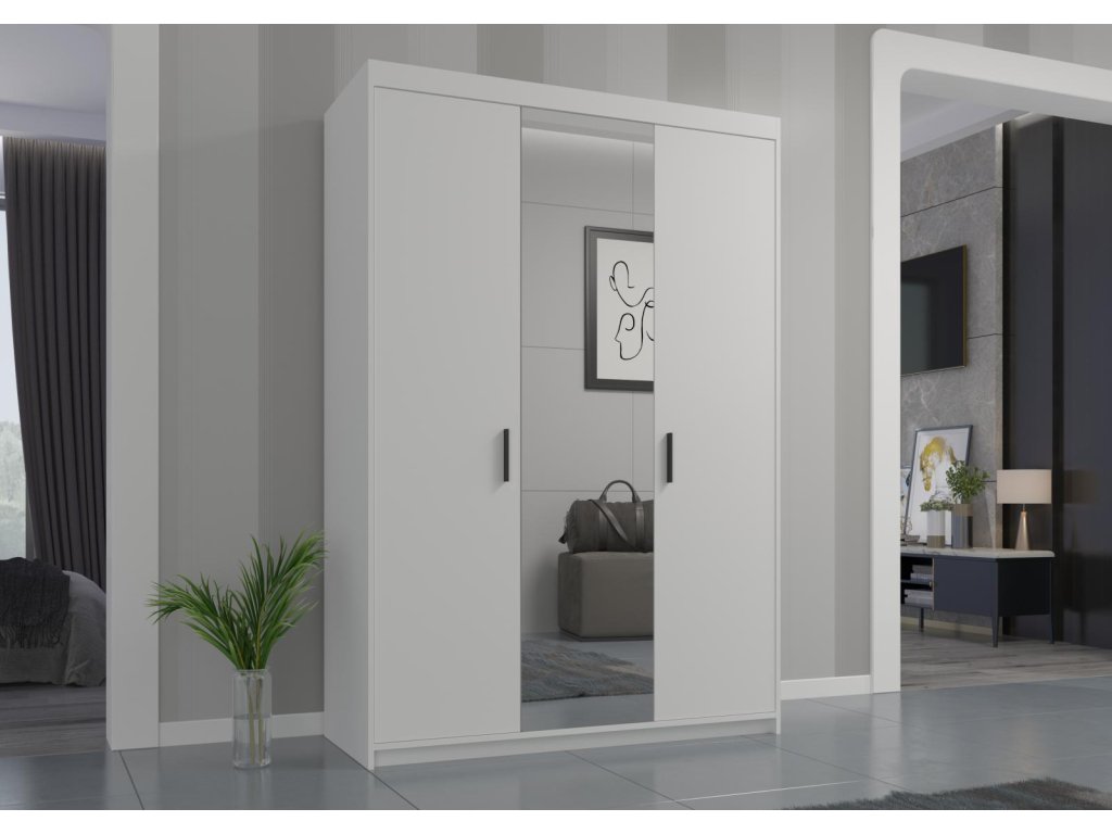 Klasická třídveřová skříň v jednoduchém čistém designu v bílé barvě s černými úchyty má vevnitř 5 polic v jedné části a polici s šatní tyčí v části druhé. Na prostředních dveřích je praktické zrcadlo. Skříň je vyrobena z lamina o tloušťce 15mm. Tuto skříň nabízíme také v dalších provedeních (šířka, barevné kombinace, počet dvířek a zásuvek). Ke skříni je možné dokoupit také nádstavec, který také naleznete v naší nabídce. Zboží je dodáváno v demontu se schematickým návodem k montáži.