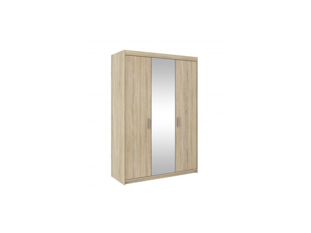 Klasická třídveřová skříň v jednoduchém čistém designu v barvě dub sonoma s černými úchyty má vevnitř 5 polic v jedné části a polici s šatní tyčí v části druhé. Na prostředních dveřích je praktické zrcadlo. Skříň je vyrobena z lamina o tloušťce 15mm. Tuto skříň nabízíme také v dalších provedeních (šířka, barevné kombinace, počet dvířek a zásuvek). Ke skříni je možné dokoupit také nádstavec, který také naleznete v naší nabídce. Zboží je dodáváno v demontu se schematickým návodem k montáži.